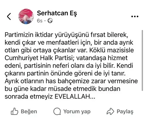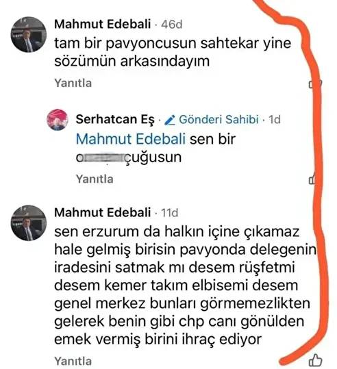 Yaşananlar sıcaklığını korurken; CHP Erzurum İl Başkanı Serhat Can Eş, sosyal medyada yaptığı paylaşıma yorum yazan, üç dönem Çat İlçe Başkanlığı yapan Mahmut Edebali’ye küfürle cevap verdi.
