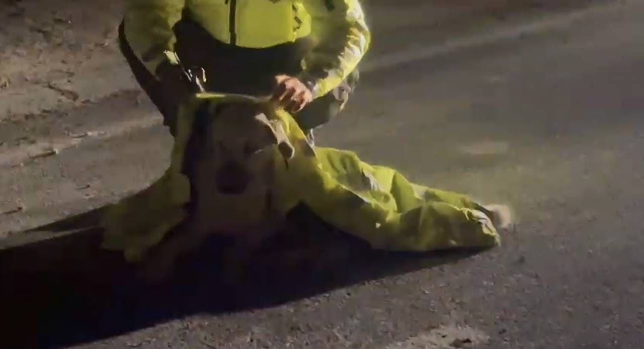 Ekipler, olası bir kazanın önüne geçmek amacıyla çevrede güvenlik önlemi alırken, durumu Hatay Büyükşehir Belediyesi ekiplerine bildirdi. Yaralı köpeğin üşümemesi için bir polis memuru montunu üzerine örttü.